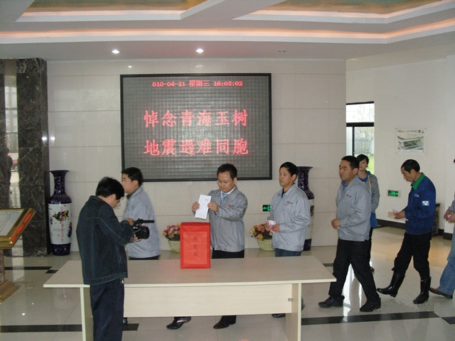 2010年4月14日青海玉樹發(fā)生里氏7.1級(jí)地震,災(zāi)區(qū)的信息牽動(dòng)著公司每個(gè)員工的心,公司員工陸續(xù)通過各種方式向地震災(zāi)區(qū)表達(dá)自己的一份心意。4月21日舉國哀悼,下午4:00,公司組織員工對(duì)青海玉樹的同胞們進(jìn)行捐款,捐款前公司員工對(duì)地震中的遇難者進(jìn)行默哀。共有326人參與本次活動(dòng),所得善款共計(jì)15885元,善款將通過銅陵市紅十字會(huì)送達(dá)災(zāi)區(qū)。