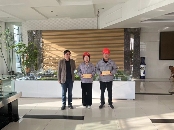 20231115日下午3時,公司總經(jīng)理張啟明向受到表彰的周陵元、賀慧玲給予現(xiàn)金獎勵,并與他們合影留念。